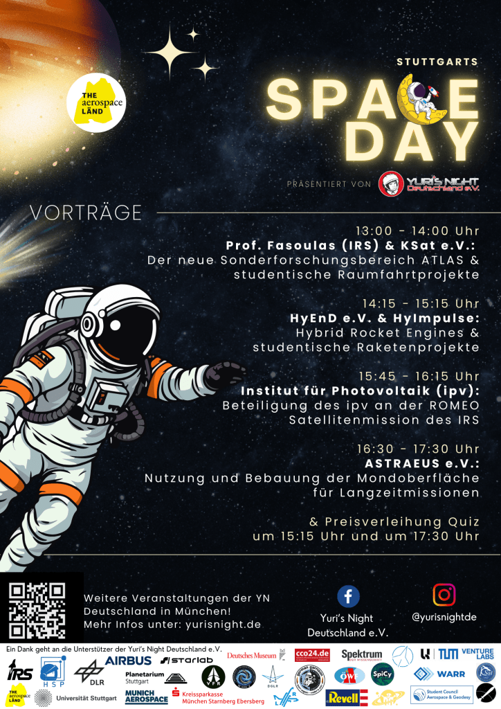 Am 12. April 2025 findet in Stuttgart zum vierten Mal der Space Day statt! Organisiert von Yuri’s Night Deutschland e.V. könnt ihr im Planetarium Raumfahrt wieder hautnah erleben!