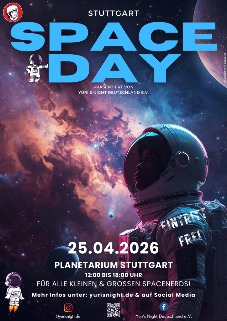 Am 25. April 2026 findet in Stuttgart zum fünften Mal der Space Day statt! Organisiert von Yuri’s Night Deutschland e.V. könnt ihr im Planetarium Raumfahrt wieder hautnah erleben!
